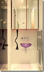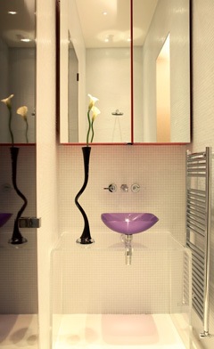 A small bathroom space get enhanced with mirrors and bright purple fitting!