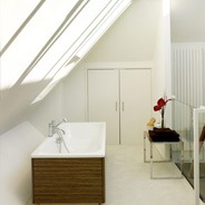 This small landing space is turned into a gorgeous and relaxing bath-space complete with a sunroof.